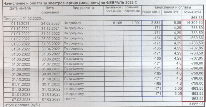 Исторически так сложилось, что за электроэнергию плачу столько, сколько указано в ежемесячной квитанции. Ранее, раз в год энергопоставщик делал сверку, а потом ежемесячно начислял какое-то количество киловатт-часов "по среднему", которое и я оплачивал по текущему тарифу. Обычно "среднее" получалось чуть больше реального потребления и после сверки получался уменьшенный платёж, но после приобретения разной бытовой техники, полагаю это несколько изменилось. В феврале я обратил внимание, что сверка не делалась уже больше года и решил сам передать показания. В марте получил вот такую квитанцию с перерасчётом: Меня насторожила итоговая цифра, но после звонка на горячую линию все сомнения развеялись: Действительно, применена очень хитрая математика. Кто ещё не понял, как выполнен перерасчёт: Получена разница киловатт-часов между переданными показаниями и выполненной 15 месяцев назад сверкой. Вся разница пересчитана по текущему тарифу. Из образовавшейся суммы вычтены рубли полученных ранее еже