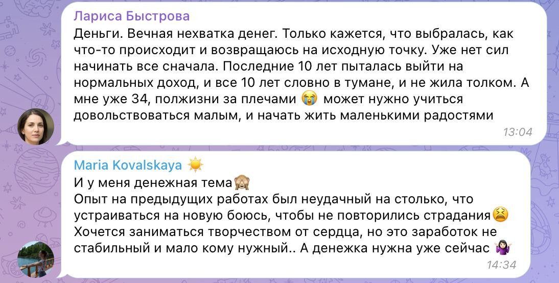 Такие вопросы мне поступают в Телеграм канал Лучшая жизнь, хотя он о саморазвитии, а не про деньги. И я решила расширить его тематичность и писать там в том числе про деньги. Да, у меня есть канал про доходные сайты и многие меня ассоциируют с этой темой, но все же, я не только про это. все, кто знают меня лично, в курсе, что я мастер диверсификации. Я бы даже сказала, что это моя суперсила. Я зарабатываю на сайтах, социальных сетях, рекомендательных системах, я проводила курсы по заработку, инвестирую в крипту, акции и недвижимость. И часто мне есть что сказать на тему заработка и финансов гораздо шире, чем просто в рамках доходных сайтов. А что касается вопросов, которые на скриншоте. В первом случае я бы советовала убрать фокус на деньгах. Но при этом это не значит “довольствоваться малым”. Но если вы не получаете удовольствие от своей деятельности - сложно заработать большие деньги. Когда я начала заниматься сайтами, конечно, я хотела зарабатывать деньги в сети. Но первое - это б