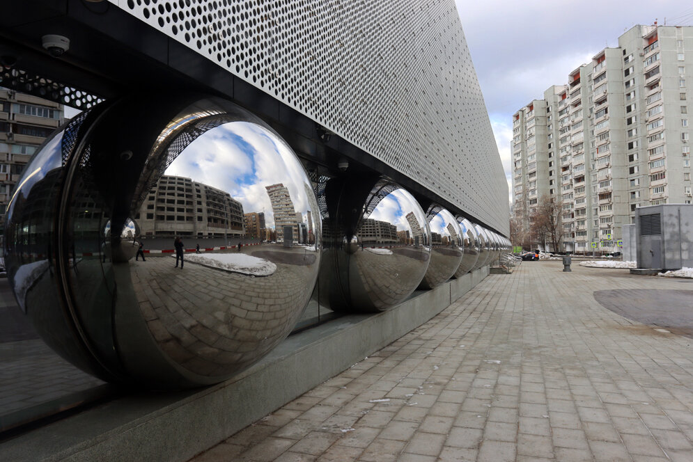 1. Начну с краткого рассказа о наземной пересадке с новой станции «Марьина Роща» БКЛ на одноимённую платформу. Выйдя из наземного вестибюля, вы должны проследовать налево, а затем вдоль этих замечательных шариков в сторону вот того зеленоватого панельного дома (2-я улица Марьиной Рощи, 20) на заднем плане примерно 100 метров и перейти по пешеходному переходу 5-й проезд Марьиной Рощи.