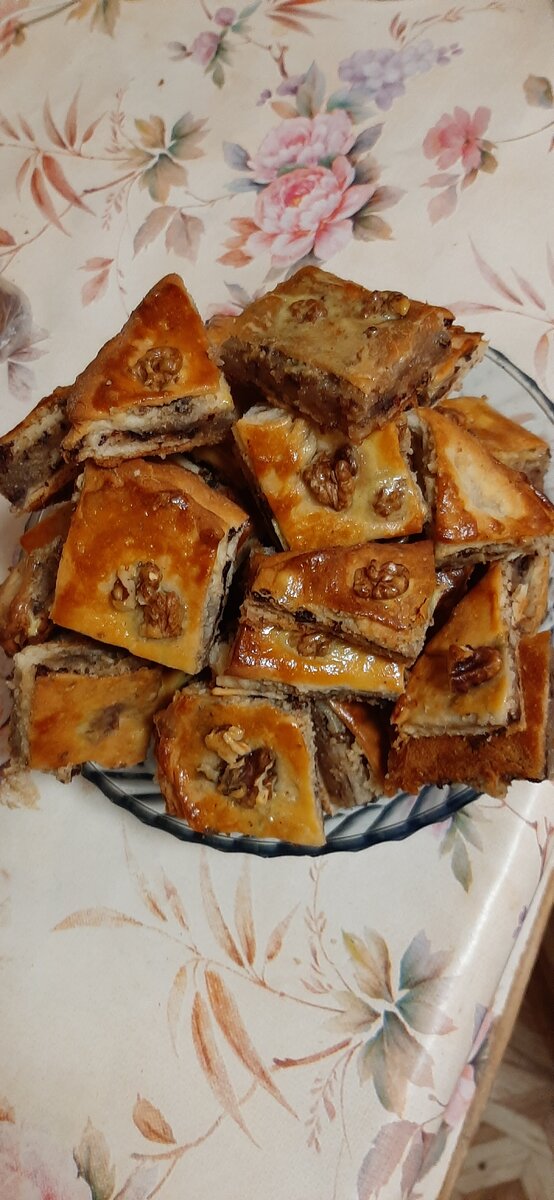 Для теста: 1 стакан молока, 1 пачка маргарина или сливочного масла, 1/2пачки дрожжей 4 яйца 6 стаканов муки Молоко подогреваем, маргарин топим до жидкого состояния и вливаем в молоко. Добавляем 4 яйца. 3 столовых ложки сахара, 1/2 ч. ложки соли 6 стаканов муки и замешиваем тесто. Вымешиваем до тех пор, пока не станет отлипать от рук. Ставим в холодильник на 1/2 часа. Пока тесто стоит в холодильнике, готовим ореховую начинку. Для этого очищаем ядра грецких орехов от скорлупы, или берем уже очищенные 400 грамм ядра грецких орехов и пропускаем их через мясорубку и смещиваем с 1/2 стакана сахара. Доьавляем 200 гр. мелкого изюма. Тесто вынимаем из холодильника и разрезаем на 12 частей Я выпекала пахлаву из 6 слоев в 2 листа. Раскатываем первый тонкий слой прямоугольной формы на подпыленом мукой столе. переносим на лист и выкоадываем по верх начинку - орехи м сахаром и изюмом. Далее раскатываем 2 тонкий слой и и кладем поверх начинки. И так 6 слоев. Далее