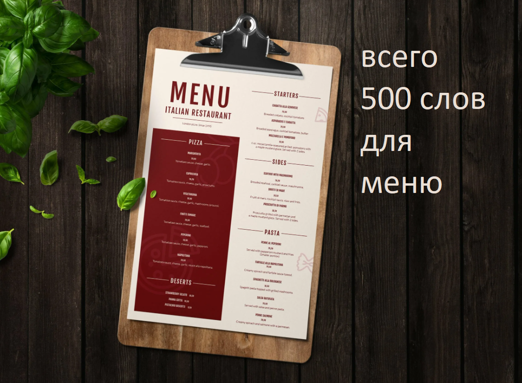 Сегодня мы поговорим о меню ресторана, как о предмете, который вы даете своим гостям для того, чтобы они сделали заказ. Рассмотрим насколько этот предмет удобен для чтения и какие ограничения в себе он несет. Обычно гость делает свой выбор за 10-15 минут. Что же можно сделать за это достаточно короткое время? В первую очередь, человек должен прочитать меню. Карта блюд – это не книга или статья, а значит он будет останавливаться и задумываться о том, нравится или не нравится ему та или иная позиция, какого размера будет порция, насколько она дорога. Следовательно, читать он будет медленно и вдумчиво и на само чтение потратит минут 5-7, а остальное время – на анализ и обсуждение (если гость пришел не один) прочитанного. А вы знаете, что средняя скорость чтения взрослого человека в нашей стране составляет 100-150 слов в минуту? Давайте теперь подумаем, сколько слов за среднее время изучения меню успеет физически прочитать средний человек? Если взять нижние границы всех приведенных значен