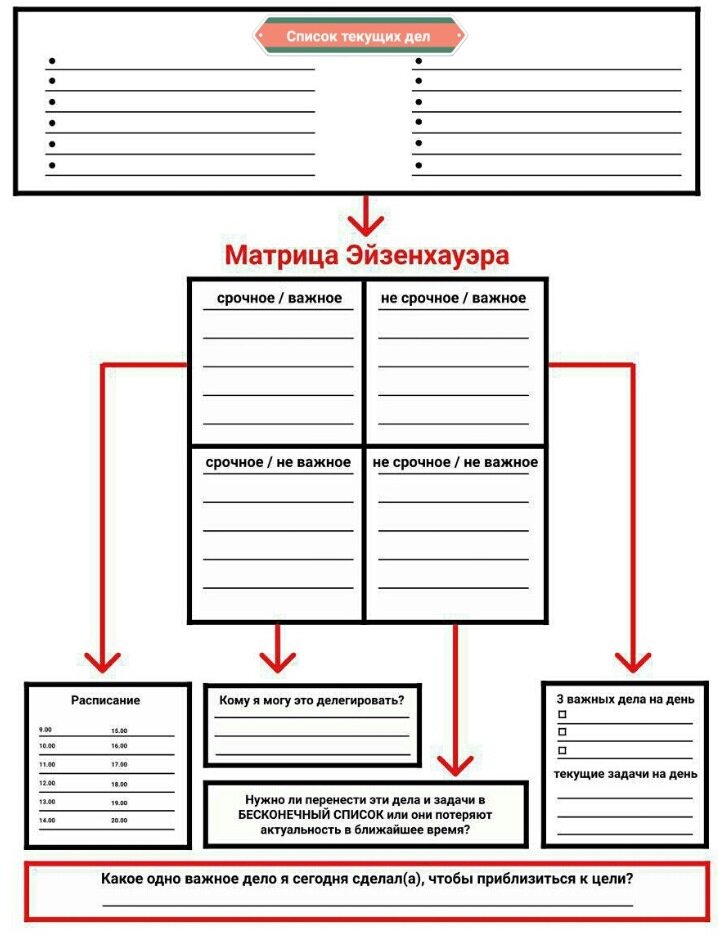 По легенде, матрицу придумал 34-й президент США Дуайт Эйзенхауэр. Можно встретить упоминания, что он использовал матрицу на президентском посту. Официального подтверждения этому не было. В 1984 году матрицу впервые описал Лотар Зайверт — в книге «Ваше время — в ваших руках». Популярность метод приобрёл чуть позже — в конце 1980-х. Стивен Кови рассказал о нём в книге «Семь навыков высокоэффективных людей». В чём смысл матрицы? Техника помогает быстро рассортировать дела из списка, даже если их много. Внешне всё выглядит просто — достаточно сформировать список задач и ответить на два вопроса о каждой из них: Да/Нет Да/Нет Как использовать матрицу Эйзенхауэра в тайм-менеджменте Как найти баланс между всеми четырьмя ячейками? Для начала важно научиться правильно распределять задачи внутри квадрантов. Есть несколько способов использовать матрицу в тайм-менеджменте. В «идеальном мире» мы сначала решаем задачи из квадрата B, в оставшееся время делаем задачи из квадрата A. После у нас ост