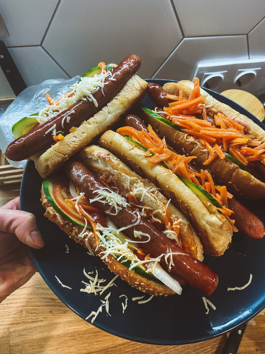 Любите стрит-фуд, тогда обязательно приготовьте домашние хот-доги. Для приготовления нам понадобится: Подготавливаем овощи, помидоры и лук нарезаем полукольцами, огурцы кольцами. Сосиски отвариваем или обжариваем в зависимости от предпочтений. Булочки разогреваем в духовке, и начинаем собирать, на дно размещаем соуса на ваш вкус, сосиску, по края размещаем овощи, сверху выкладываем сыр и морковку. Приятного аппетита!