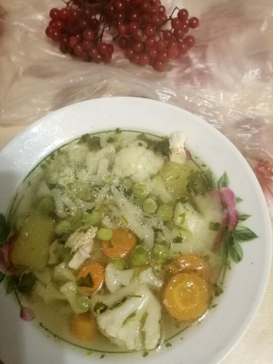 Готовимся к обеду. Достаём овощи из морозилки. Капуста цветная, брокколи, перчик красный и зелёный, бобы, горох. Кабачки и морковь, зелень сельдерея и укроп. Овощи у меня в морозилке уже полуготовые. Овощи, кроме помидоров, свёклы, моркови, кабачков, тыквы и баклажан, сырыми морозить нежелательно, так как они начинают выделять запах силоса. Всё это я пишу для тех, кто вдруг решит купить морозильную камеру, и чтобы этот человек не совершил такую же ошибку, как я в первый раз. Кабачок и морковь пока ещё хранятся без морозилки. Отвариваем мясо, то которое вам можно (у меня сегодня индейка), опускаем овощи, добавляем специи и соль. После закипания варить 5 минут. Суп готов! Приятного аппетита! Да, моркови всего 40 г, для красоты. + 2 фото Больше общения и рецептов - в группе "Рецепты для диабетиков" в ВКонтакте! Рецепт на странице ВК Автор рецепта – Татьяна Симакова