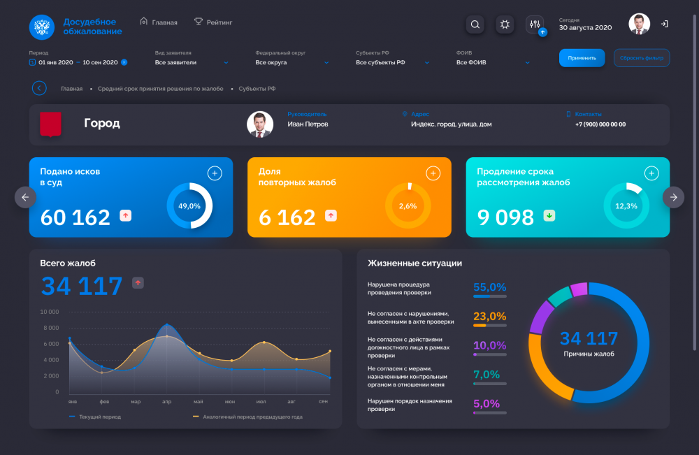На дашборде вице-премьера отражены показатели эффективности работы системы по стране: общее количество жалоб, нарушение сроков, средний срок принятия решений по всем субъектам. На панели министра отражаются те же показатели, но в разрезе министерства.