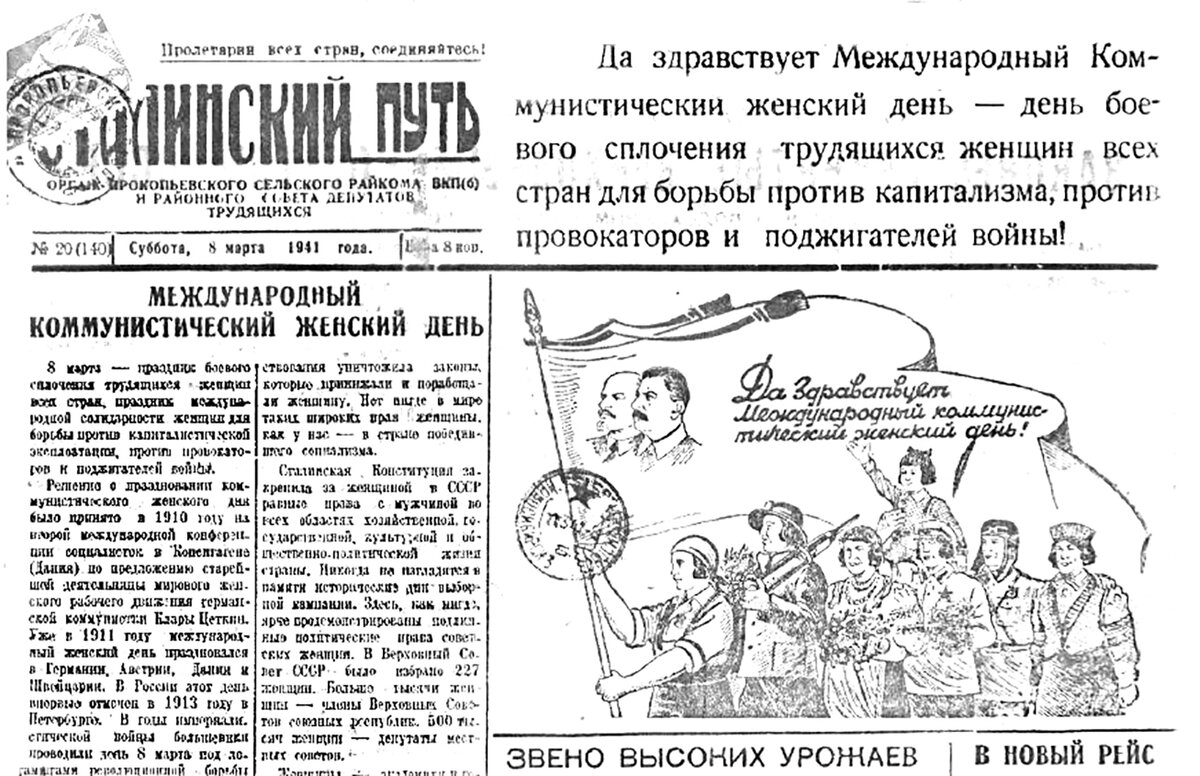 войны и перебоев с продовольствием, мы, конечно же, не нашли, так как «Селяночка» впервые вышла в 1939 году. Первое упоминание о Международном женском дне мы обнаружили в 1941 году. Тогда наша газета выходила под названием «Сталинский путь» и была объёмом в 4 полосы. В праздничном номере были опубликованы законы, принятые Верховным Советом СССР, новости района и зарубежья, рассказывали о женщинах-передовиках. В этот год поддержали инициативу работниц и