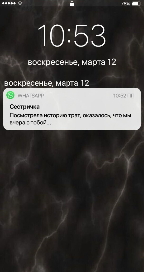 Уведомления на экране блокировки позволяют просмотреть часть сообщения, не читая его. Порой это спасает, если нет времени, но хочется глянуть одним глазком что же тебе написали. Но некоторые смс, когда не видно всего текста, а только начало, могут испугать. Представляю вам подборку таких сообщений. Однажды я получила похожее сообщение, когда подруга написала мне после похода в ресторан. Оказалось, что мы нечаянно оплатили чужой счет (на баре все перепутали). Пришлось снова ехать в тот ресторан и выяснять детали, благо они извинились и проблему быстро решили. Получая такие весточки, с одной стороны очень хочется узнать продолжение, а с другой... Сразу мысли о плохом. разбила? Поцарапала? Очень интригующее сообщение от брата. Вдруг он узнал семейную тайную или страшную легенду, которая предается из поколения в поколение? Тут даже можно предсказать чем закончилась стирка. Скорее всего, платье либо полиняло, либо село. Худший вариант - порвалось. Однажды стиральная машинка умудрилась пор