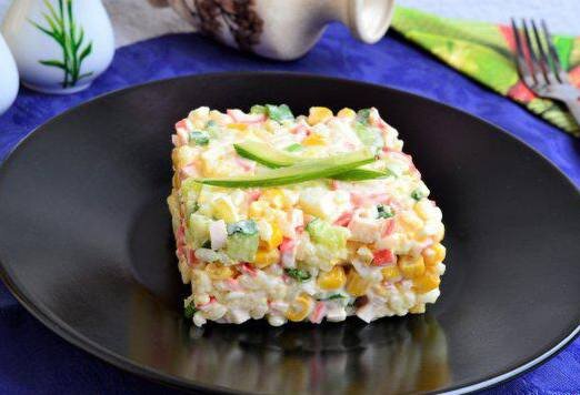 В глубокой миске смешайте рис, яйцо, крабовые палочки, огурцы, консервированную кукурузу, майонез, соль и тщательно перемешайте.