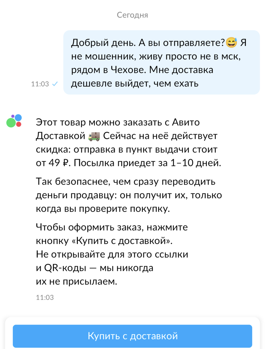 Решаю заказать с авито доставкой- она вроде и недорогая была, а ехать куда-то мне гораздо дороже, чем по почте пересылать! Так что захожу оформить покупку и мне совершенно самостоятельно выскакивает объявление, мол, вам доступна скидка на доставку.