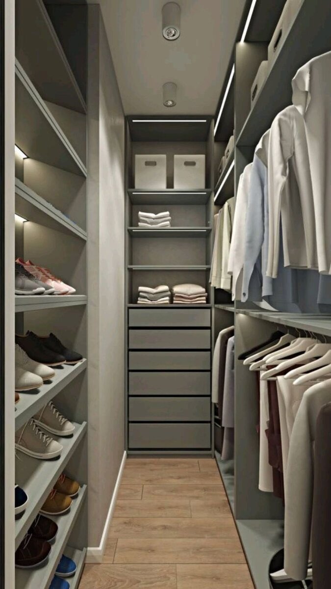 Прием декоратора: чтобы гардеробная не превратилась в заваленный чулан, нужно заранее распланировать ее загруженность, отталкиваясь от количества и габаритов одежды и обуви. Вплоть до количества вешалок, которые должны висеть штангах, высоты шкафов со штангами (для длинных пальто или наоборот коротких блузок), размеров ящиков для хранения несенной одежды. Особенно если есть ограничение места, то используем всю высоту до потолка.