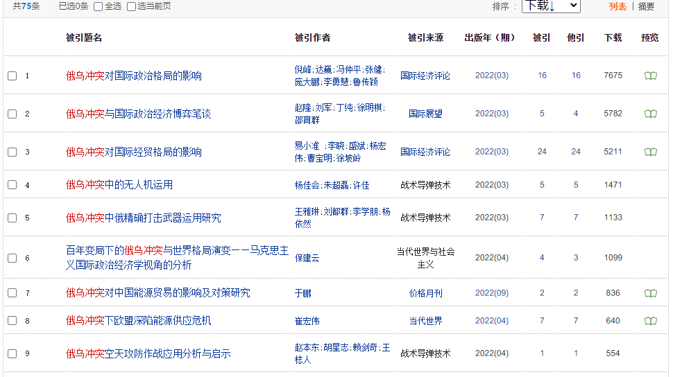 Вот с 2022 года по настоящее время, большое количество китайских ученых начали изучать « российско - украинский конфликт». Ниже приведены названия девяти работ, которые связаны с этой темой и являются самыми загруженными.