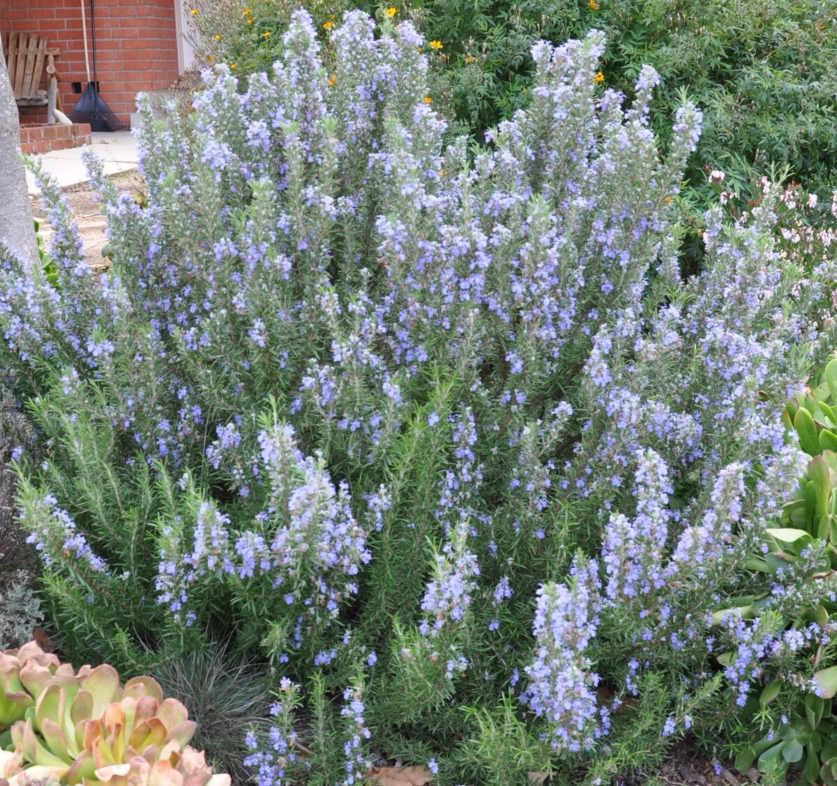 Обожаю это растение, за его приятный, нежный аромат, за его неприхотливость и выносливость. Я рассказывала, как-то уже здесь, что часто его использую в кулинарии, при запекании рыбы в фольге, или добавляю к мясу. Сегодня розмарин популярен во всем мире, его с давних пор культивируют как целебное и ароматическое растение. Розмарин применяется в качестве приправы для ароматизации супов, вторых блюд и соусов. Как пряность розмарин широко культивируют в Индии, в Африке, в Южной Европе. Особенно хорошо сочетается эта пряность с рыбой, мясным фаршем, жареной птицей, грибами. Ее также добавляют к овощным блюдам и супам, а также к салатам. Популярно сочетание розмарина с белокочанной и красной капустой, его также добавляют в маринады. Для придания пряного вкуса розмарин добавляют к мягким сырам, мясу дичи, к баранине, сдобному тесту и картофелю. В кулинарии розмарин также используют для ароматизации масла и соли. Обладая качествами антиоксиданта, розмарин является естественным консервантом для пищевых продуктов. В прошлом году, в сентябре, мы были на рынке в Темрюке, купили рыбу, чтобы запечь её на костре и очень хотелось веточку розмарина, но в развалах рынка его не нашлось, хотя там всегда отличный выбор зелени и мне посоветовали обратиться к цветочникам и тем , кто продаёт растения. Мы пошли на другой конец рынка и увидев, что продаётся куст розмарина в горшке, попросили отщепнуть небольшую веточку, что нам любезно и сделали, а я, в знак благодарности, рассказала, как я готовлю тушёного сома с луком и молоком!!!!!