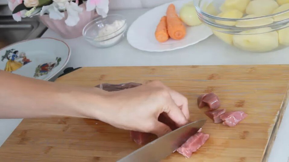 Этот суп готовится довольно быстро за счет того, что не нужно долго вываривать бульон. В составе нет никаких круп или макарон, лишь картофель, морковь и лук. Свою нежную текстуру суп приобретает благодаря сливкам и части овощей, которые нужно перетереть в пюре. Мясная чорба — отличный вариант супа для разнообразия. Но думаю, что если вы его один раз попробуете, то обязательно будете готовить еще! Он не похож на все остальные супы и очень вкусный! Давайте приготовим вместе: Кастрюлю с водой ставим на огонь и ждем, пока она закипит. А пока подготовим все остальное. Мясо (у меня говядина, но можно брать и свинину) нарезаем небольшим кубиком. Чтобы это было делать проще, мясо должно быть слегка подморожено. Картофель нарезаем средним кубиком или брусочками — как больше нравится. Морковь и лук также режем небольшим кубиком. В сковороде разогреваем сливочное масло, добавив каплю растительного, чтобы сливочное не горело. Затем обжариваем мясо 3-4 минуты под крышкой, периодически помешивая. По