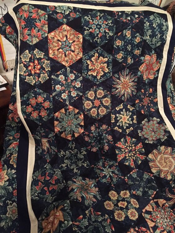 Я не первый раз работаю в технике "Калейдоскоп", но продолжаю удивляться и восхищаться. Сравнительно легкая в исполнении, она позволяет получать огромное количество вариаций. Их настолько много, что перед тобой стоит только одна проблема - какой из узоров выбрать, а какими пожертвовать. Для тех, кто не знаком с техникой, с большим удовольствием представлю ее. Можно полистать галерею. Сначала о супер-важном и характерном для этой техники: 1. Самые лучшие мотивы получаются из тканей с крупными цветами или узорами. 2. Ваш кусок ткани должен содержать 6 или кратно шести патернам. Патерн - это тот фрагмент узора, который повторяется. На нижнем фото палочками я показала как повторяются патерны. То есть фрагмент между одинаковыми цветами, завитками, хвостиками птичек или кончиком носа лисичек - это патерн, при условии если после него узор полностью повторяется. На фото ниже - стопка из шести, абсолютно одинаковых по узору, лоскутов. Разрезаем сложенные стопкой патерны, используя шаблон "р