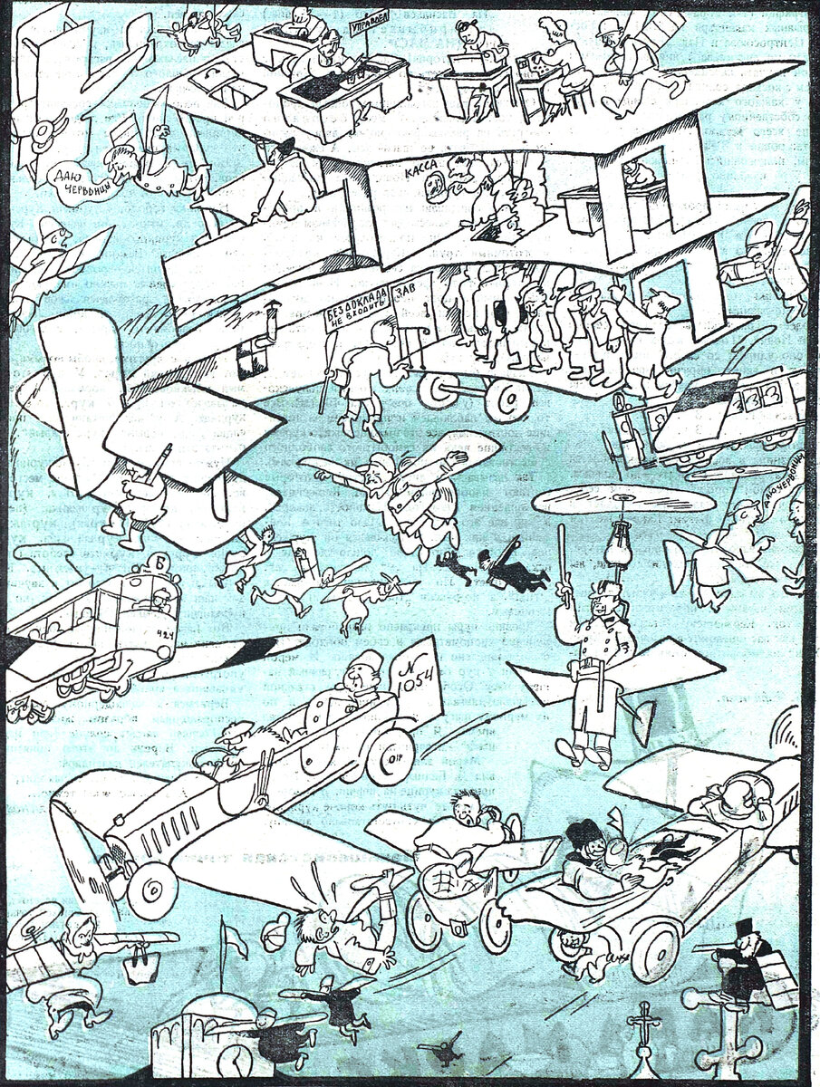 Сегодня - очередная "многофигурка" Константина Ротова с названием "В ближайшем будущем". Рисунок традиционно упреждает цитата: "Несомненно, что в ближайшем будущем вместо недоступных и дорого стоющих аэропланов, будут всем доступные воздушные мотоциклетки". (Из статьи). Под рисунком - традиционно плохие стихи. Идет событий череда