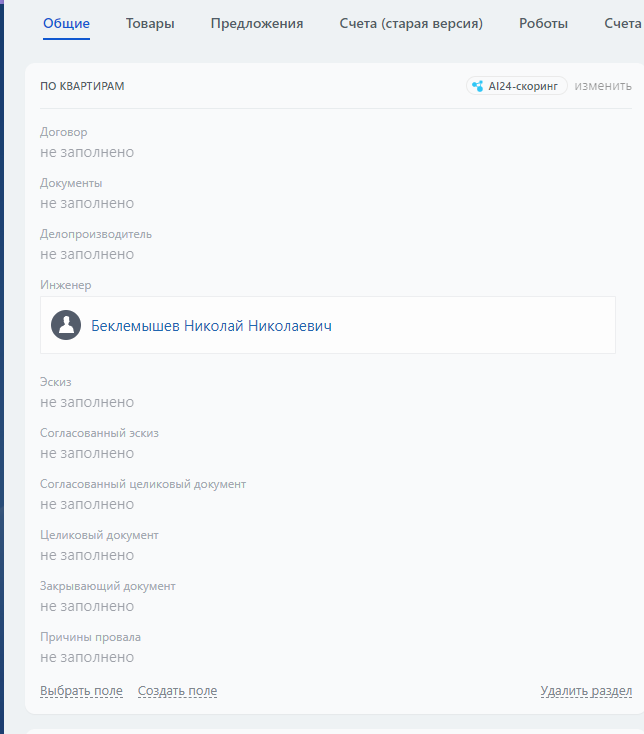 О ЗАКАЗЧИКЕ Компания WALLS & PAPERS помогает своим клиентам с согласованием переустройства и перепланировки квартир и нежилых помещений. В спектр услуг компании входит все от проектирования до согласований и оформления документации. ЗАДАЧА ПРОЕКТА В компании возникла необходимость чёткой регламентации работы менеджеров, инженеров и делопроизводителей, отслеживание этапов проведения клиента по воронке продаж, понимание выполняемых в данный момент времени задач для клиента и ответственного сотрудника. По сути требовалось автоматизировать рабочий процесс по сделке сделав его четким и прозрачным от начала и до конца. РЕАЛИЗАЦИЯ Всю автоматизацию решили настроить на роботах. При создании сделки ответственному менеджеру автоматически ставится задача на подготовку пакета документов. Для каждого документа создано соответствующее поле в карточке сделки. После завершения задачи менеджером сделка с помощью триггера переходит на вторую стадию. На ней с помощью робота менеджеру ставится задача отпр