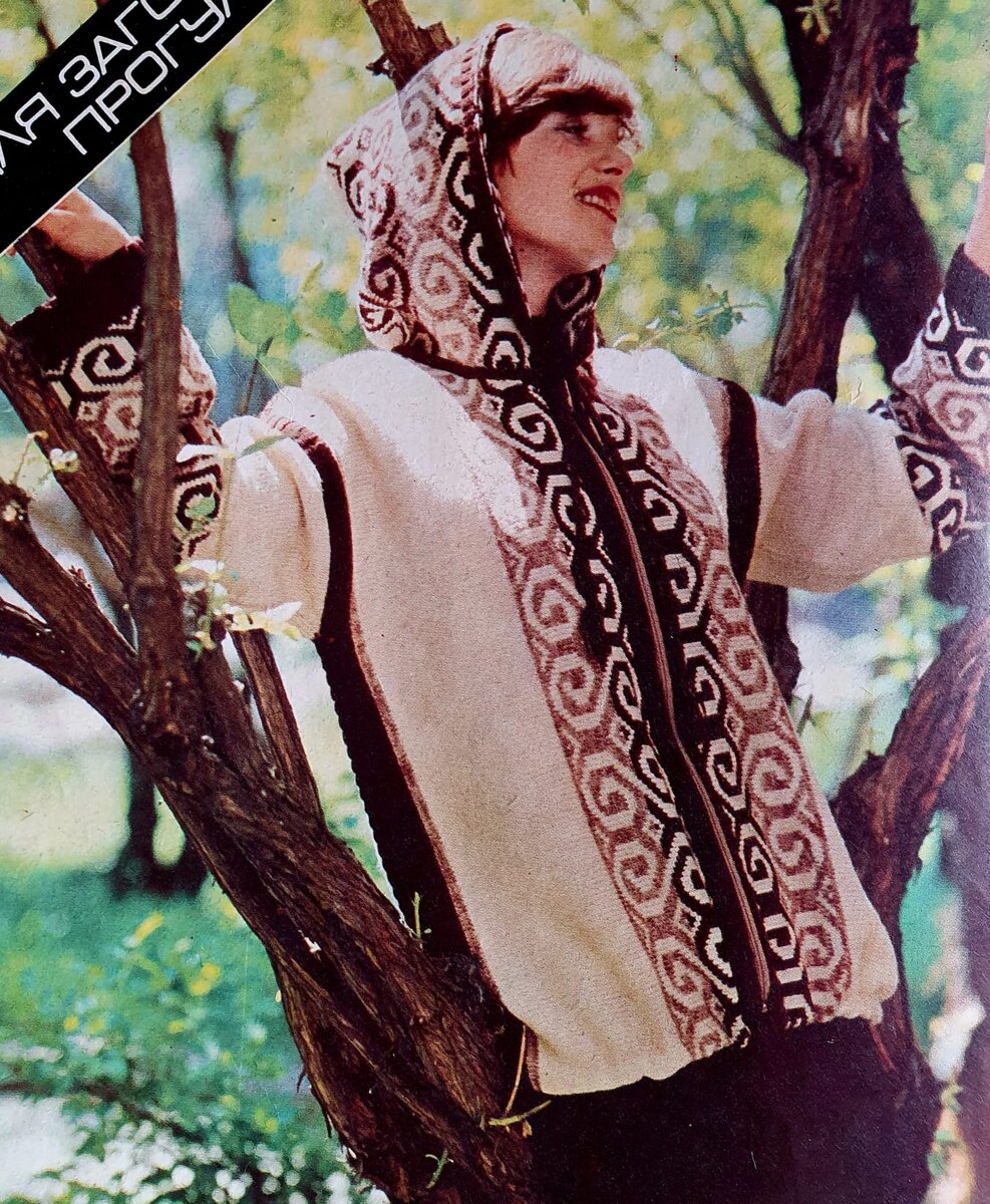 Вы любите вязать орнамент? Это кропотливо. Но интересно. Размер куртки 46 - 48. Потребуется 550г основного цвета (белого), по 100 г коричневого и бежевого цвета. Полочки. Вяжутся поперек, от середины. Рассчитать количество петель на 58 см. Набрать петли коричневыми нитками. Сначала вязать 1,5 см резинкой 2 х 2. И далее вязать орнамент по схеме. Одновременно прибавлять петли для горловины по выкройке. Через 7 см начать убавления по линии плеча. Закончить вязание полочки полосой бежевого цвета чулочной вязкой и шириной в 1 см и полосой коричневого цвета резинкой 2 х 2 и шириной 3 см. Спинка. Тоже вяжется поперек от бока. Набрать петли, чтобы было 60 см и вязать сначала 3 см коричневыми нитками резинкой 2 х 1. Потом идет полоса бежевого цвета чулочной вязкой и шириной в 1 см. Затем вязать основу белой нитью, вывязывая плечо, вырез и второе плечо согласно выкройки. По другому боку так же сделать полосы бежевого и коричневого цветов. Рукава. Сначала сшить плечевые швы. От линии проймы