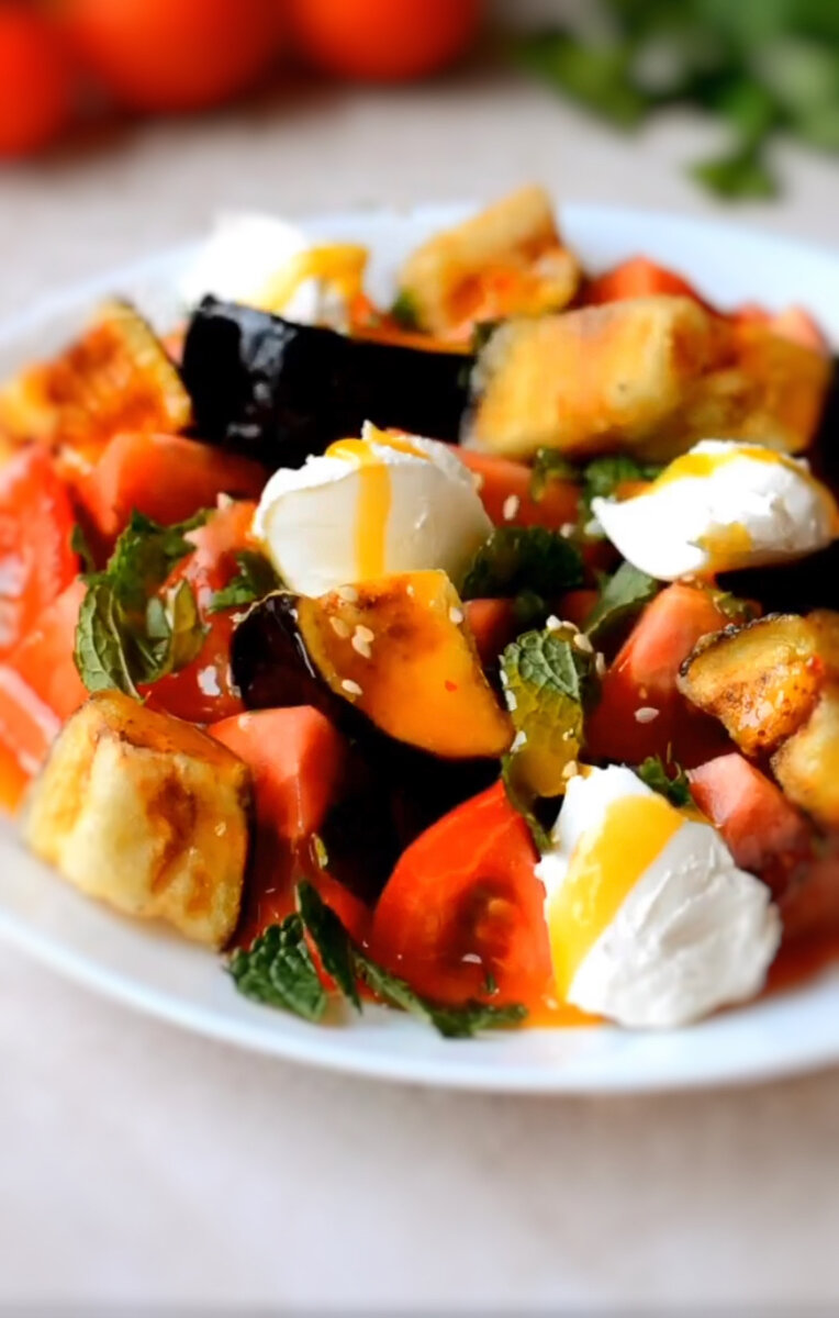 - На блюдо выложите томаты, зелень и хрустящие баклажаны. Чайной ложкой сделайте небольшие шарики из творожного сыра. Полейте салат заправкой. Посыпьте кунжутом и семенами подсолнечника.