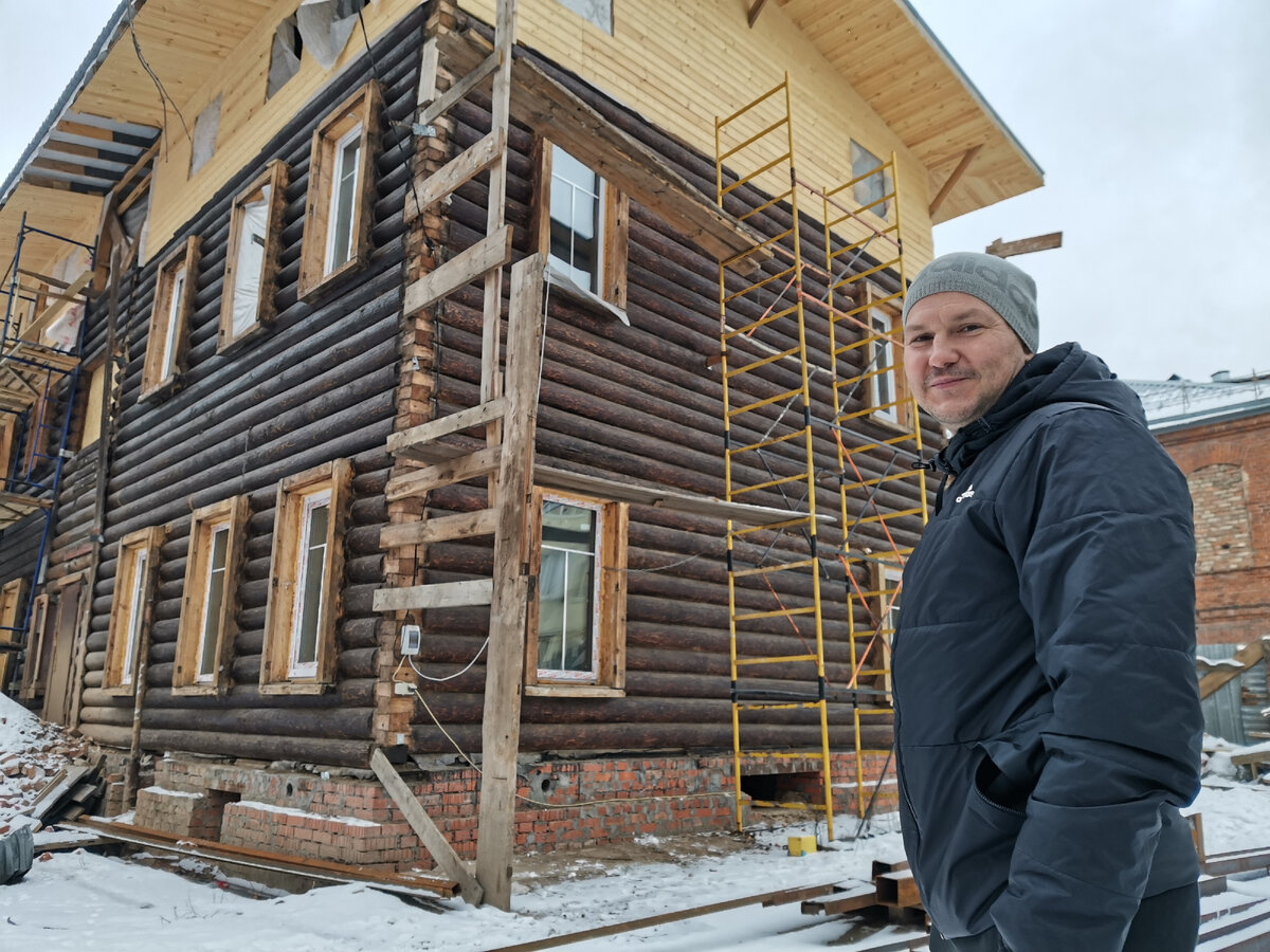 И хочет открыть в нем кафе и хостел для туристов. Игорь Ионку работает пожарным в спецчасти МЧС, но когда я встретился с ним возле строящегося дома, мне показалось, что он настоящий прораб. «Все демонтажные работы внутри проведены, заменена крыша, надстроен мансардный этаж, выполнили браширование бревен», – окидывает он хозяйским взглядом плоды реставрации. С мансардой дом 78 на улице Горького будет чуточку выше, но не выйдет за пределы дозволенных 10 метров. Постановление областного правительства закрепило за этим кварталом статус исторического. Игорь Беноневич восстанавливает на свои средства бывший купеческий особняк и хочет открыть в нем кафе, хостел, небольшой центр развлечений. Название уже придумал – «Дом друзей». Раздавая распоряжения бригаде ремонтников и отделочников, Игорь попутно рассказывает историю своего приобретения. На Авито попалось объявление о продаже дома напротив школы №1. Собственник, юридическое лицо, потерял к нему интерес: высотная застройка здесь запрещена,