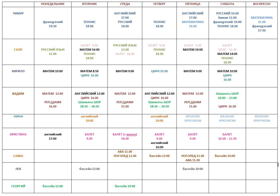 В начале сентября я составляла план доп.занятий для детей и думала, что таким он останется до конца учебного года. Но не тут-то было)) За полгода некоторые репетиторы поменялись, других пришлось добавить. Например, мы взяли Кириллу на пять дней в неделю репетитора по математике. После месяца занятий поняли, что он нас не устраивает, нашли другого и остались так довольны, что сразу перевели к ней ещё и Галю. Затем мы нашли репетитора английского для Вадима, а через некоторое время решили записать к ней Кристину с Ниной. Тимур выразил желание учить вторым языком французский (у нас ближайшие родственники живут во Франции и фр.язык желательно знать) и ещё раз в неделю консультироваться с репетитором по химии, так как в школе учительница химии очень требовательная и нужно разбираться в предмете на хорошем уровне, чтобы иметь отличные оценки. Это сработало, второй триместр Тимур закончил без единой четвёрки. У Вадима добавилось утреннее длинное занятие в шахматной секции ШОР. В субботу м
