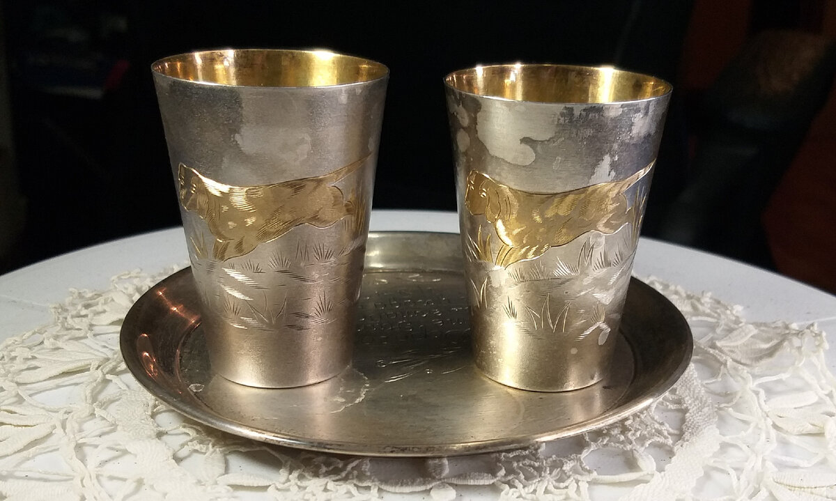Дорогие друзья! Сегодня я хочу показать вам винтажные мельхиоровые стопки - подарок моей тете Ираиде Ивановне на ее День рождения, а от кого не помню, да сейчас это уже и не важно. В детстве я их очень любила, не удивляйтесь столь не детской приверженности к питейным приборам. Дело в том, что название этого набора "Охотничья собака. Сеттер." Так что, все дело оказывается в этой собачке, которую мне очень хотелось иметь, и которую родители нам никак не позволяли заводить, вот и приходилось довольствоваться и общаться с этой. Я даже здоровалась всегда с ней, когда приходила к тете Ире в гости. Может быть и поэтому этот набор стоял у них на видном месте. Надо сказать, что набор был посеребрен, а сам сеттер покрыт позолотой, выполнен он был штихельным рисунком талантливо и очень натурально. Шерстка казалась гладкой и шелковистой, а его уши, развивающиеся на ветру, просто покоряли меня. Мы с братом в шутку называли эти стопочки "Набор охотника", наши детские фантазии уносили нас далеко в л