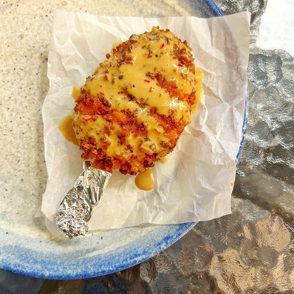 Эскимо из лосося с моцареллой из меню корнера «Дикий лосось» на Гастрокорте по 190 ₽. Внешне похоже на современное эскимо, но по сути это котлета на палочке. Сверху панировка, внутри — фарш из лососевых и моцарелла. Ну, что ещё добавить? Панировка хрустит - это прекрасно. Красная рыба со сыром — сочетание беспроигрышно вкусное. Единственный минус в том, что эскимо небольшого размера, его быстро съедаешь и хочется ещё. Оценка 9,5 из 10. Вкусно, забавно и даже палочку фольгой обернули. Люблю внимание к мелочам.