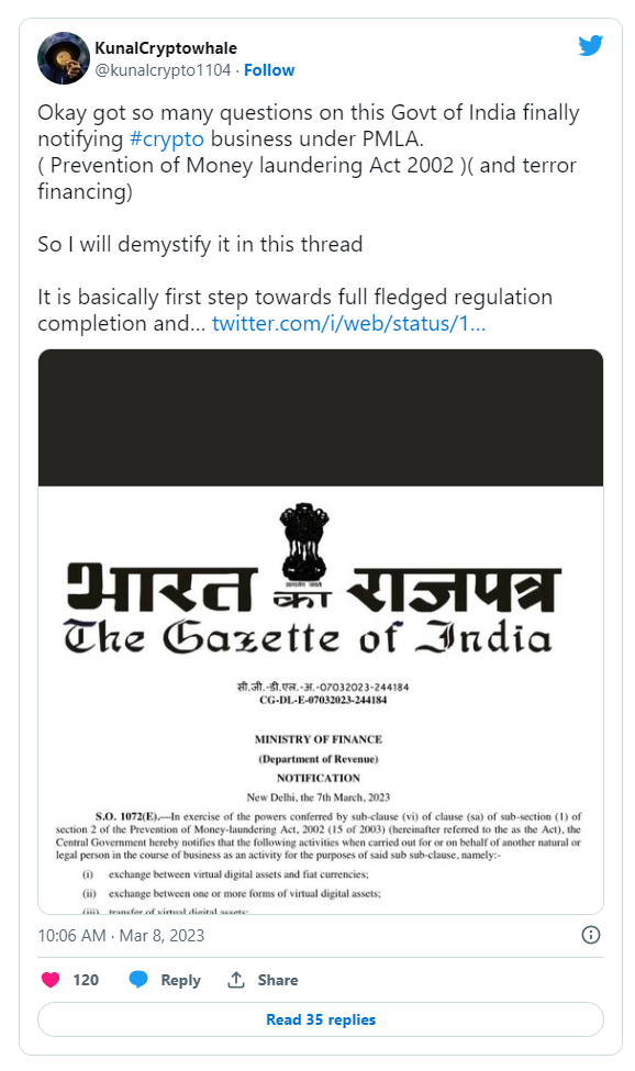 Позиция Индии в отношении транзакций с криптовалютой и токенами в последнее время стала предметом многочисленных дискуссий. Теперь министерство финансов страны выпустило уведомление, в котором излагается его план по регулированию виртуальных цифровых активов и разъясняется применение антикоррупционных положений Закона о предотвращении отмывания денег (PMLA) к криптоиндустрии. В уведомлении говорится, что любая цифровая информация, код, номер или токен, созданные с помощью криптографии или любого другого метода, за исключением индийской наличности или иностранной валюты, будут классифицироваться как «виртуальные цифровые активы» в соответствии с законом о подоходном налоге. Правительство Индии также призвало людей избегать финансовых услуг, связанных с предложением и продажей виртуальных цифровых активов. Этот шаг будет иметь серьезные последствия для заинтересованных сторон в криптоиндустрии. Правительство Индии классифицировало криптовалютные биржи , поставщиков кошельков, хранителей