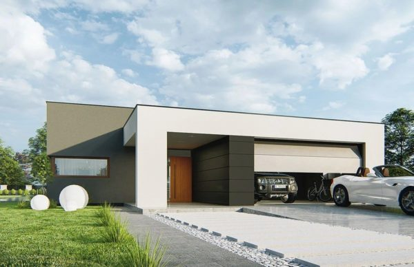 Трендовый минимализм – проект одноэтажного дома с плоской крышей, гаражом на 2 авто, террасой, 3 спальнями и гостиной с камином, 192 кв.м.