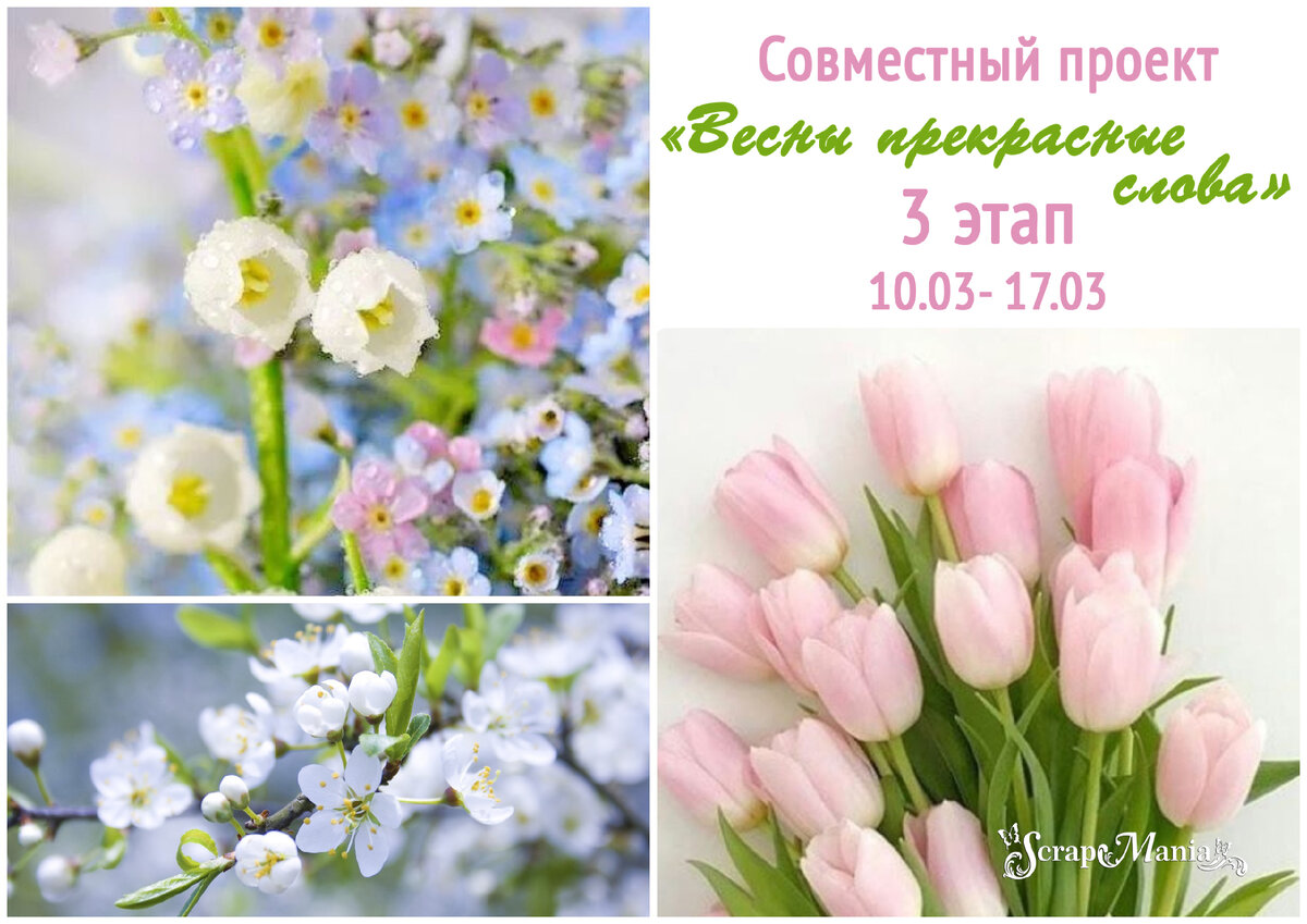 - Для участия в нашем проекте напишите пост на своей страничке вКонтакте. В нем разместите фото свои открыток (не менее 2 шт, представленные в посте на одной фотографии), напишите что участвуете в СП "Весны прекрасные слова" от группы scrapmania_tm (через @), добавьте баннер и хэштэг с этапом #SM_спСловаВесны_3.