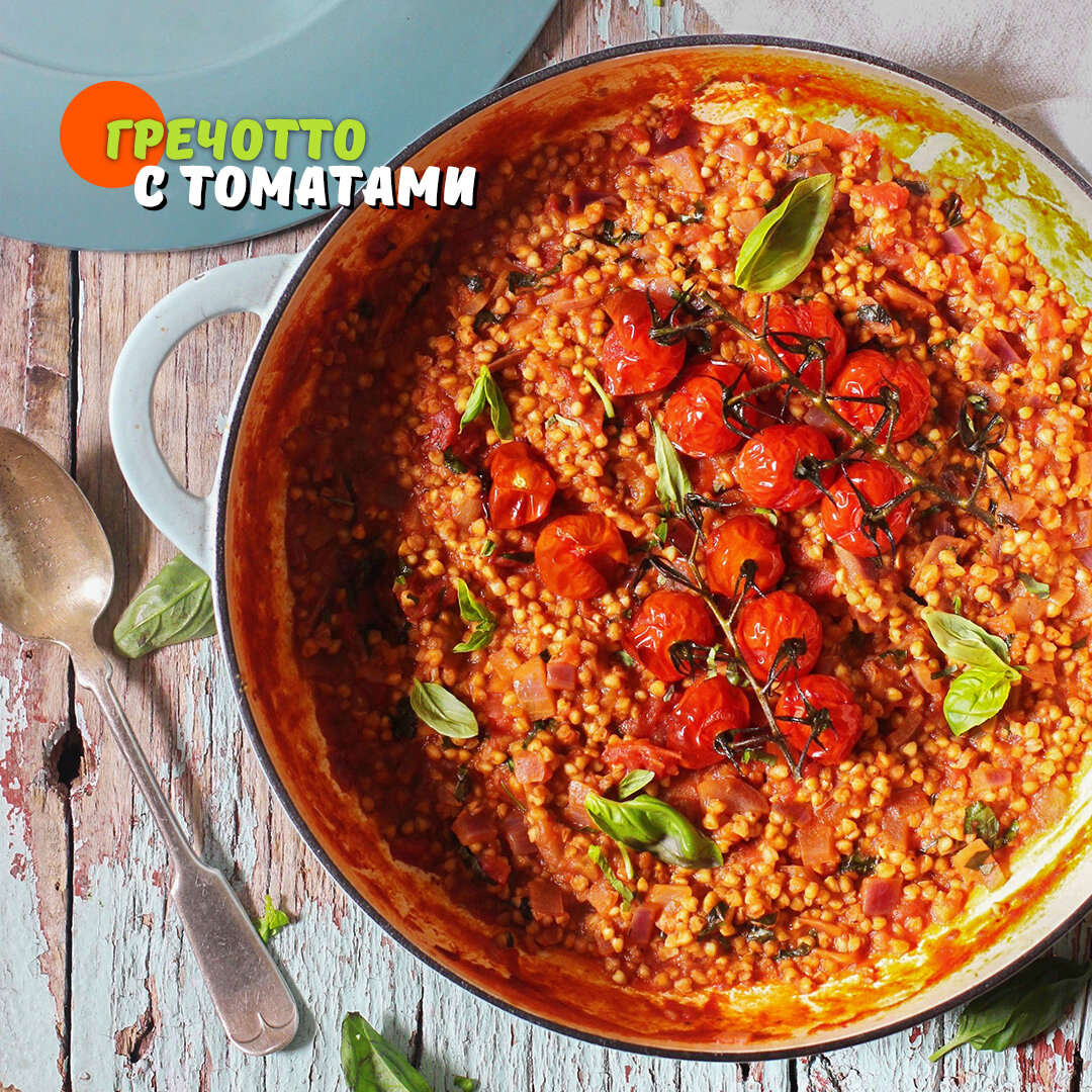 🔸 базилик – 1 пучок 👩🍳 Пошаговый рецепт 1️⃣ Шаг Половину помидоров нарезать дольками, выложить на противень, сбрызнуть маслом, посолить и запечь в духовке в течение 20 минут при 200°С. 2️⃣ Шаг На оливковом масле обжарить лук и чеснок до полупрозрачности. 3️⃣ Шаг Оставшиеся помидоры мелко нарезать и перемешать с образовавшимся соком, добавить в готовый бульон. Снова перемешать. 4️⃣ Шаг Гречку высыпать на сковороду к луку, залить половиной бульона с томатами. Тушить до впи