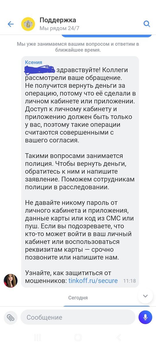 Начну из далека. Было дело в декабре 22г, приходилось мне оплачивать услуги грузчиков в онлайн приложении банка Тинькофф. Их было 5 человек и каждому надо было перевести в районе 2тр на разные личные счета в разных банках. Оплатил трём со своего мобайл Тинькофф, а дальше не получается. Раздается звонок, оператор Тинькофф и я: Т: Здравствуйте kid007 есть подозрение на проведение мошеннических операций по вашему счету. Вы совершали оплаты в последние 30 минут. Я: да это я делал спасибо за беспокойство все норм, откройте доступ к оплатам. Т: извините кому вы оплачивали? ФИО сумму и банк. Я: (напрягаюсь) вспоминаю называю. Т: назовите свои паспортные данные. Я: называю. Т: для подтверждения, что это вы выйдите с нами на видеосвязь... Короче спасибо за беспокойство оператору Тинькофф все сделал как она просила, блокировку сняли, всем грузчикам заплатил. Теперь интересное. В конце февраля вышли на меня мошенники, и я заплатил им достаточно крупную сумму (среднемесячная ЗП) Конечно виноват са