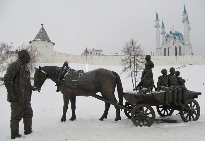 У подножья Казанского Кремля стоит бронзовая скульптура пожилого мужчины в рабочей одежде и тюбетейке. Он ведёт под уздцы лошадь с сидящими в телеге детьми. Это одна из моих самых любимых скульптурных композиций города. Она называется "памятник Благотворителю". Прототипом возчика стал казанский фермер Асгат Галимзянов, посвятивший свою жизнь помощи детским домам и приютам, а также пострадавшим от различных катастрофы. Асгат-абый родился в селе Апастовском районе Татарстана в 1936 году. Его отец ушел на фронт, вернулся с войны без обеих ног. Семья жила бедно, есть порой было нечего – бывало варили суп из крапивы и пекли хлеб из лебеды. По окончании школы парень ушел служить в армию. Вернувшись, решил отправиться в Казань: работал в милиции, на химкомбинате, а в конце 70-х годов устроился возчиком на Колхозный рынок. В его задачу входило развозить продукты по магазинам. Заезжая на рынок за товаром, мужчина часто видел, сколько продуктов выбрасывается. Однажды пришла к нему мысль завести