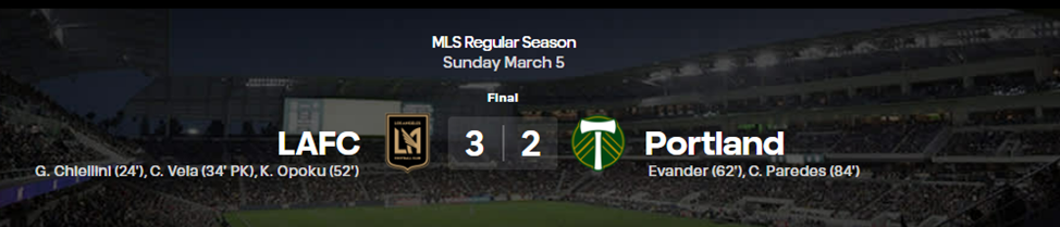 Команды MLS уже начали свое участие в лиге чемпионов КОНКАКАФ, о чем мы обязательно поговорим, а пока все-таки о матчах второго тура, хоть он и не вышел таким насыщенным, как первый. Ну, матчи не переносили, и хорошо. 5 марта в борьбу вступил чемпион и обладатель кубка MLS – LAFC. Перед матчем с Портлендом им вручили чемпионские перстни за прошлый сезон На церемонию приехал Гарэт Бэйл — Major League Soccer (@MLS) 4 марта 2023 г.Ring ceremony time for the champs. 💍 pic.twitter.com/vQhb5iuVBt Ретвит Болельщики устроили перформанс, — Major League Soccer (@MLS) 4 марта 2023 г.This tifo though >>> pic.twitter.com/MVA3Tp0YMu Ретвит а Уилл Фаррелл раздавал интервью — Major League Soccer (@MLS) 4 марта 2023 г.Will Ferrell has major plans for the MLS Cup trophy. 😂 pic.twitter.com/oidA1um2nD Ретвит Разобравшись с прошлым сезоном, новый тоже не стали откладывать в долгий ящик и к 52 минуте Портленд был вбит по шляпку 3:0. Правда, вспомнив, что скоро игра в Коста-Рике в рамках лиги чемпионов, LA