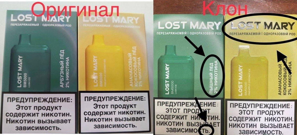 В данный момент времени появились кучи версий клонов. Упаковки сделаны максимально схожими с оригиналом, но отличия все равно есть. Рассмотрим как отличить оригинал от подделок низкого и среднего качества: Лицевая сторона: 1. На клоне расстояние на устройстве между строк и надпись на устройстве Lost Mary крупнее , чем на оригинале 2.Перевернутая надпись Lost Mary на крышке коробочки, в отличие от оригинала 3.на клоне Расстояние между текстом и рамкой на предупреждающей надписи больше чем на оригинале 4.На коробочке название вкуса на клоне прописано в 2 строки, на оригинале в 1 (клюквенная сода) 5.На коробочке картинка устройства напечатана ближе к левому краю , в отличие от оригинала Задняя сторона: 1.На коробочке, предупреждающий текст напечатан ближе к левому краю, в отличие от оригинала 2.На коробочке на основном тексте поля у клона уже , в отличии от оригинала 3.На коробочке расстояние между последним абзацем больше чем на оригинала Разберем фото нового издания Lo