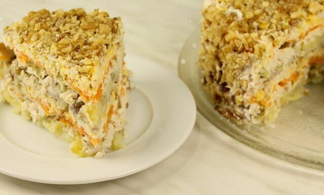 Такой салат будет торжественно смотреться на праздничном столе. Подготовить его лучше заранее, чтобы слои успели пропитаться соусом. 🔥 Лучшее в телеграм: Посмотреть Ингредиенты: Способ приготовления: Шаг 1. Подготовьте ингредиенты. Отварите картофель, морковь и яйца. Нарежьте тонкими полукольцами лук. Грецкие орехи измельчите при помощи скалки. Куриную грудку отварите в подсоленной воде. Шаг 2. Разогрейте сковороду с растительным маслом, обжарьте лук до мягкости. Шаг 3. Куриную грудку нарежьте небольшими кусочками. Шаг 4. Маринованные огурцы измельчите кубиком. Шаг 5. Натрите а терке отварные овощи и яйца. Шаг 6. Установит на блюдо для подачи салата кулинарное кольцо. Соберите салат в следующей последовательности: 1/2 от массы тертого картофеля — 1-2 часть поджаренного лука — 1/2 курица — майонез — 1/2 маринованных огурцов — майонез — 1/2 моркови — майонез — 1/2 части тертого сыра — майонез — 1/2 яйца — майонез — грецкие орехи. Далее повторите слои в той же последовательности. Шаг