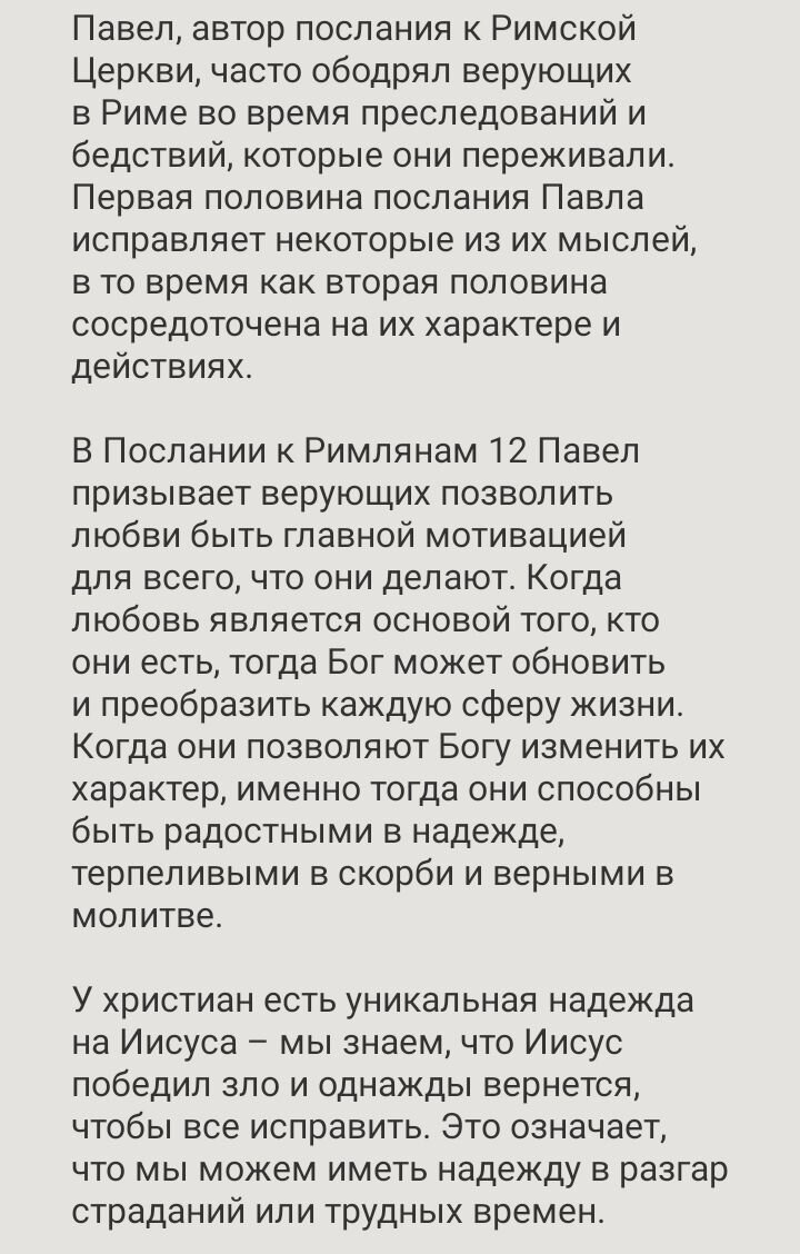 пусть надежда приносит вам радость; будьте стойкими в беде; неустанно молитесь; Христианам в Риме 12:12 Как создать сильный характер? Как вы можете применять этот стих в своей жизни? Молитва