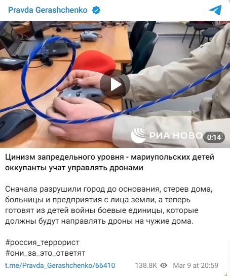 Российские военные обучают детей из Мариуполя управлять дронами — такое видео распространяют в украинских пабликах и телеграм-каналах. Якобы готовят «из детей войны боевые единицы, которые должны будут направлять дроны на чужие дома». В ролике, который распространяют украинские медиа — воспитанники донецкого республиканского центра БПЛА имени Владимира Жоги. Там готовят пилотов дронов-камикадзе и разведывательных беспилотников. Обучение на симуляторах длится три недели — после этого ученик начинает тренироваться на настоящем беспилотнике. «Ребята на симуляторе обучаются пилотированию FPV-дронов (от первого лица — пилот видит то же самое, что и беспилотник). Первым делом это дроны-камикадзе, барражирующие боеприпасы. И второе — это дроны, сбивающие чужие дроны», — рассказал инструктор. В донецком центре имени Владимира Жоги проходят подготовку добровольцы, военные из числа мобилизованных и юнармейцы. Юнармия и сама обучает азам управления беспилотниками, но уже взрослых людей. Чтобы нау