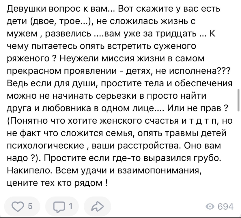 «не сложилась жизнь с мужем, развелись…вам уже за 30, к чему пытаетесь встретить суженого ряженого?»