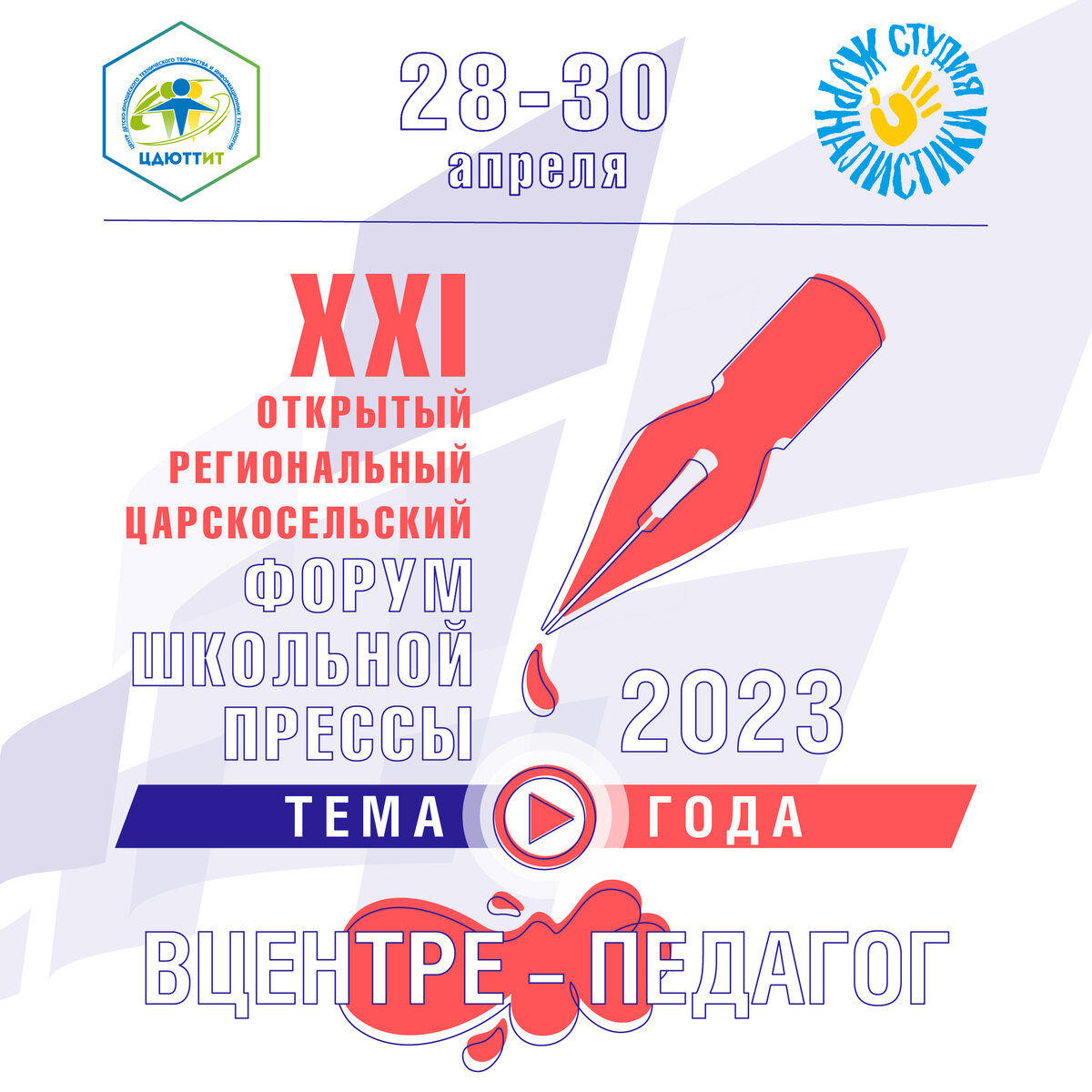 28-30 апреля 2023 года в Санкт-Петербурге пройдут очные мероприятия Открытого регионального XXIЦарскосельского Форума школьной прессы. Форум проводится ежегодно. Участие в нем принимают редакции детских и молодежных СМИ из Санкт-Петербурга и других регионов России. О ТЕМЕ ФОРУМА Тема Форума «ВЦентре – педагог» соответствует Году педагога и наставника. На отборочном этапе мы предлагаем присмотреться к вашим педагогам повнимательнее: наверняка за строгими причёсками и пачками тетрадей скрывается удивительная личность! А может, порассуждать, почему у педагогики «женское лицо» и так не хватает учителей-мужчин? Или выйти из общеобразовательной школы и обратить внимание на педагогов в школах искусств, спортивных тренеров, воспитателей в детских садах? Что увидим мы, если посмотрим на педагогов с разных сторон? Когда они окажутся #вцентре нашего внимания? А с теми, кто увидит самое интересное, мы встретимся на очных мероприятиях #вЦентре технического творчества. Впрочем, говорить будем всё та