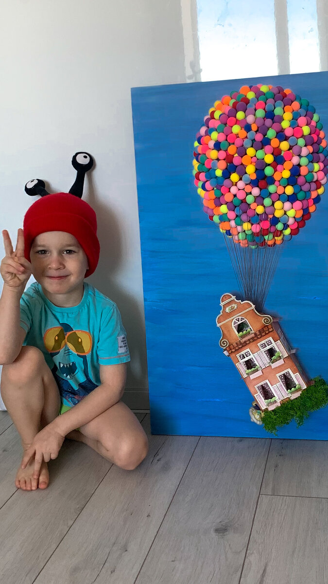 Всем привет!🙃 Дорогой читатель,дарю тебе интересную идею создания панно «Волшебный дом» Давно хотела украсить одну из стен в детской,но никак не могла определиться с выбором картины. Хотелось яркого акцента🌈,но в тоже время чтобы обязательно присутствовали небесные оттенки И вот недавно случайно на глаза попался мультик от студии Pixar “Вверх»,а именно момент когда дом взмывает вверх на шарах В этот же вечер набросала эскиз и на следующий день начала творить 🤗 Взяла обычный шарик,надула до нужно размера.Заклеила ровно половину кусочками бумаги,предварительно замоченной в ПВА. Оставляем на ночь просохнуть. Получилась закрытая полусфера Дети раскрасили его разноцветными кружочками,можно этого и не делать. Покрыла полностью его шариками,потом еще раз и еще(всего 3 ряда) Покупала на маркетплейсе,стоила в районе двухсот рублей. Собранный теремок приклеила к основанию картины. Низ домика украсила стабилизированным мхом Гуся посадила на шар Про нее то из детей никто не знал👦и сам зав