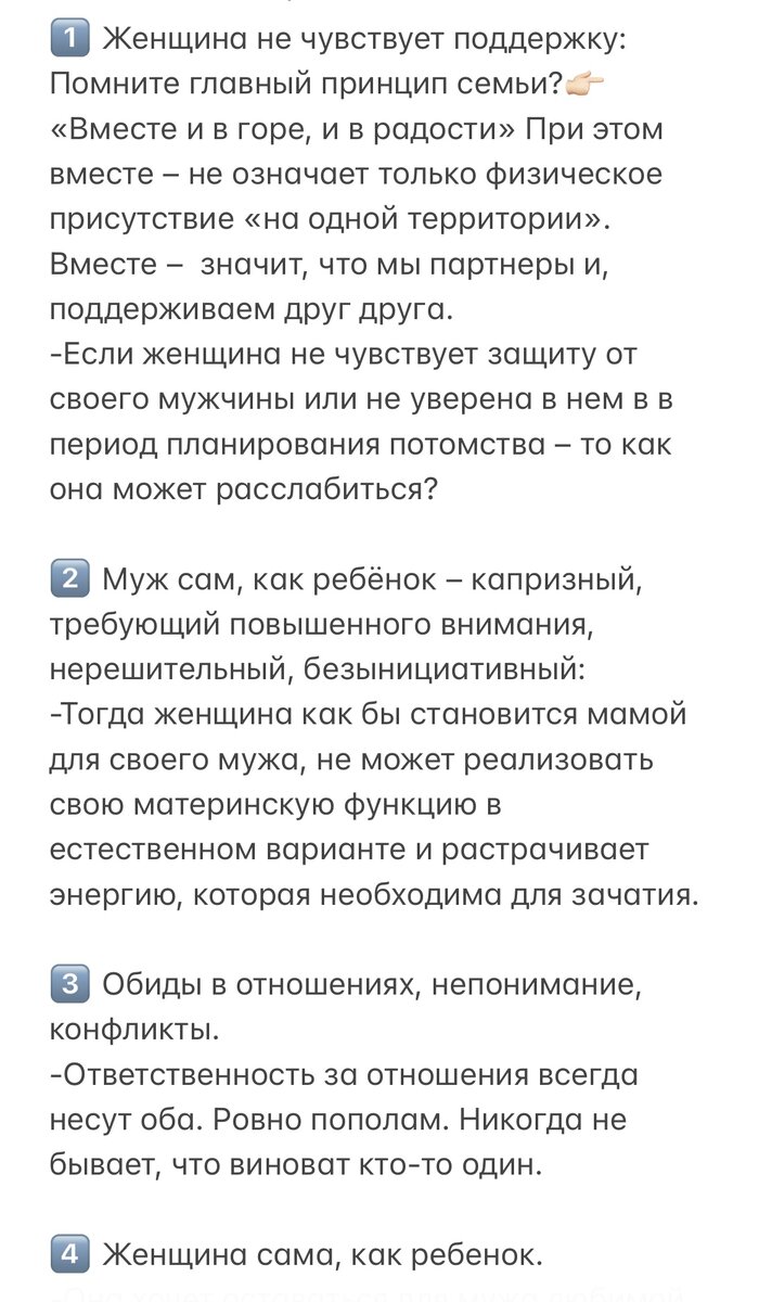 Про таких, как они обычно говорят – идеальная пара. Молодые, красивые, успешные, но только с детьми никак не получается... ⠀ Но если копнуть глубже, то в их отношениях не всё гладко: разные ценности и мечты, они перестали друг друга «слышать», каждый "на своей волне", живёт, можно сказать, своей жизнью, и вроде бы они вместе, но каждый в этих отношениях по-своему одинок. ⠀ Малыш в этом случае стал бы отличным средством от одиночества или связующим звеном между партнёрами, НО! нет ничего хуже, чем подобная мотивация для рождения детей. ⠀ Отношения между супругами – основа семьи. Они подобны почве, в которую падают семена. 🌱 ⠀ Если почва здорова, щедро удобряется и оба партнёра вкладывают свой ресурс в отношения, то– семена прорастают и дают щедрые плоды в виде крепкой семейной жизни, потомства и осознанного родительства. Но если в отношениях между супругами есть разногласия, нерешённые проблемы, созависимость, слияние, дисбаланс (кто-то один всё время отдаёт, а другой только берёт), т