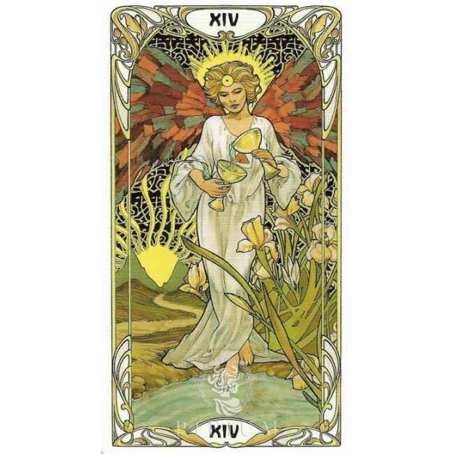На Аркане изображён гений Солнца, переливающий Жизненную силу из одного сосуда в другой. Эта эмблема символизирует вечный круговорот энергию во Вселенной. Этому Аркану присущи целесообразность, гармоничность, обновление духовных и физических сил после избавления от излишних эмоций. Вы способны существовать в соответствии со своими скромными возможностями. Соберитесь с силами, вам предстоит перемена в судьбе, возможно, далёкое путешествие. Пока есть передышка, подумайте, что вы возьмёте с собой из прошлого в будущее. Умеренность означает ожидаемое благоустройство, кооперация и сотрудничество приведут к успеху, хорошее здоровье, выход из положения. В прямом положении карта означает обновление душевных сил, избавление от лишних эмоций, смирение, спокойствие и равновесие во взглядах. Иногда, если карта выпадает после плохой, победа в борьбе с превратностями судьбы. Выход на путь правильных поступков. В перевёрнутой позиции – конфронтация, столкновение интересов. Карта предостерегает от тог