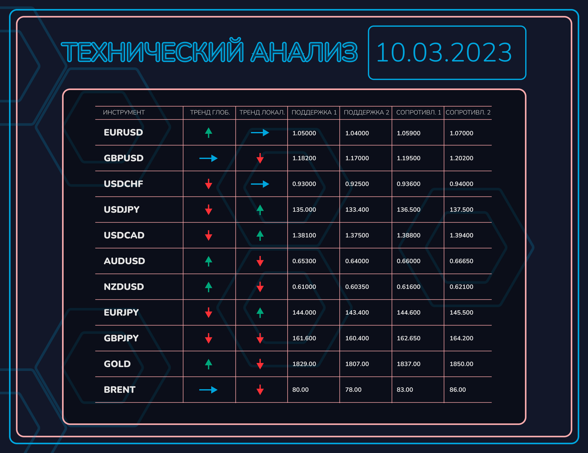 EURUSD Цена нащупала промежуточную поддержку на 1,05500. На данный момент она тестирует сопротивление на 1,05900. Пробой этого уровня отправит цену к 1,07000. Это, в свою очередь, укажет на формирование фигуры разворота нисходящего тренда "Двойное дно". GBPUSD Фунт все же смог вернуться обратно выше SMA200, но сопротивление на 1,19500 пробить не смог. Сегодня это может случиться, тогда откроется путь к 1,20200. USDCHF На дневном графике сформировалась фигура разворота восходящего тренда "Двойная вершина". Пробой уровня поддержки на 0,93 запустит начало отработки фигуры. В этом случае можно ждать снижения к 0,92200. USDJPY Отскок от SMA200, позволил пробить уровень поддержки на 136,500, но линию восходящего тренда пробить не удалось. Возможно это случится сегодня. В этом случае стоит ждать снижения к 135,000. USDCAD Рост цены продолжается . Сегодня цена будет стремиться пробить сопротивление на 1,38800. Этому будет способствовать и фундаментальный фон. Данные по безработице могут серьез