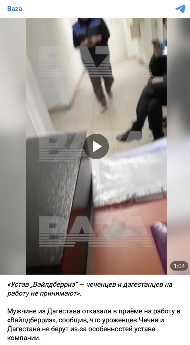 В сети появилась информация, что маркетплейс Wildberries не принимает на работу уроженцев Чечни и Дагестана. Ролик с таким содержанием появился в телеграм-канале Baza. Все из-за некоего «внутреннего устава», запрещающего работать лицам этих национальностей в компании. Это не так. В компании уже опровергли дискриминацию жителей Чечни и Дагестана, отметив их трудолюбие и доброжелательность. «Только в логистических комплексах нашей онлайн-платформы работают несколько тысяч жителей этих регионов страны. Мы очень высоко ценим их как работников и коллег, они отличаются трудолюбием и доброжелательностью», — заявили в Wildberries. Более того, в пресс-службе компании также предложили журналистам телеграм-канала Baza приехать на встречу с сотрудниками маркетплейса из Чечни и Дагестана. News.ru: В Wildberries опровергли дискриминацию чеченцев и дагестанцев.
