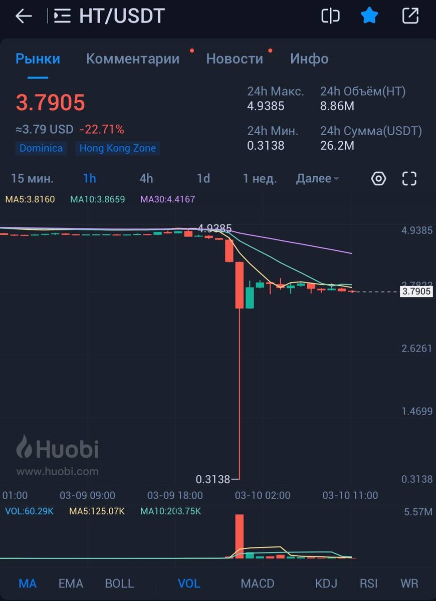 Сегодня ночью на Huobi токен HT упал на 90% за пару минут и затем вырос на 170%.