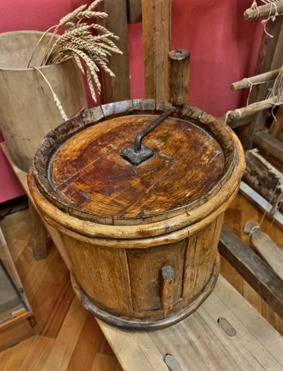 Маслобойка, которой пользовались в крестьянских семьях, представляла собой высокий клепаный сосуд, плотно закрытый крышкой, в отверстие в центре крышки опускалась мутовка, которой и пахтали, то есть сбивали налитые в маслобойку сливки или сметану, топленые в печи. В крестьянской семье она была незаменимой помощницей. Перед использованием её необходимо промыть горячей, затем сполоснуть холодной водой. Наполнить её сметаной и крутить рукоятку маслобойки. При вращении происходит движение сметаны. При длительном вращении начинают появляться частички масла, а затем и кусочки. Куски масла вынимали и выкладывали в другую посуду. Внутри маслобойки оставалась беловатая «водичка» - пахта или, как сейчас говорят – сыворотка. Из пахты пекли блины, хлеб, стряпали пироги на всю семью. Сбивание масла в семьях крестьян считалось традиционно женским делом. В экспозиции нашего музея представлена маслобойка и другие предметы крестьянского быта. Узнать больше вы сможете на экскурсиях и интерактивных прогр