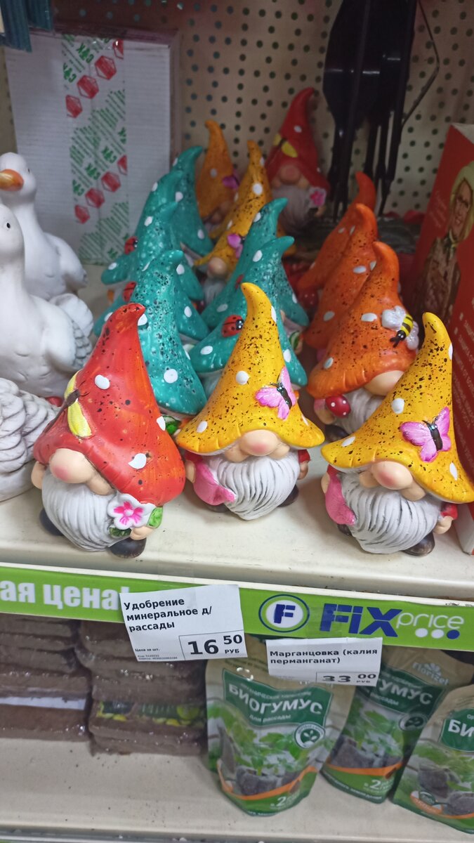 Потрясающе гномики теперь украшают витрины ФИКС ПРАЙСа. Они, конечно, больше подходят для украшения сада. Такие яркие! Есть даже с бирюзовыми шапочками, с оранжевыми. Если знаете, что человек увлекается садом, обязательно подарите ему или ей такого гномика. Они к тому же еще и с цветочками в руках. Ну прелесть же! Но если у вас дома стиль, напоминающий кантри, все веселенькое, то гномики эти тоже отлично впишутся!