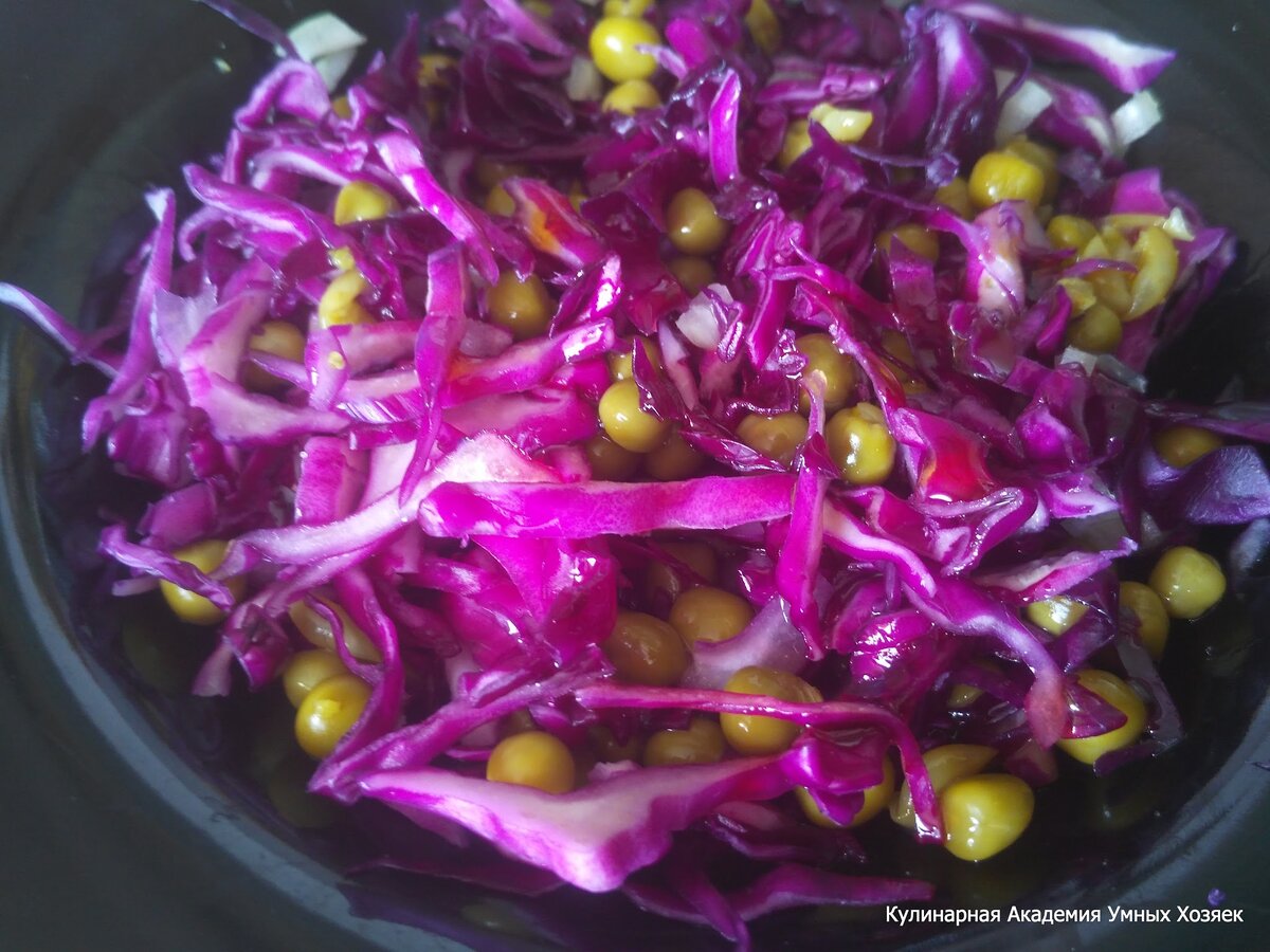 Еще один сегодняшний рецепт - простой, полезный салат из краснокочанной капусты. Такая капуста - просто кладезь полезных веществ, витаминов и минералов, ну и к тому же салат очень красивый, яркий, радует глаз, что тоже немаловажно, пока за окном бесконечная зима. Ещё и название такое подходящее. Так что рекомендую! Нам потребуется: Капуста краснокочанная - 200 г, горошек зелёный консервированный – полбанки (200 г), лук репчатый, лучше красный - 1 мален.шт., масло растительное - 2 ч.л., уксус яблочный 6% - 1 ч.л., соль, зелень для подачи. Приготовление: А как вы относитесь к такой капусте?