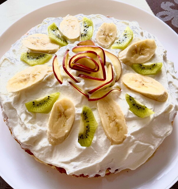 Тортик 🍰 получается очень нежный и легкий! Я делаю этот тортик либо со свежими фруктами, либо с консервированными и то и то 10 из 10! Сейчас всё подробно расскажу! Ингредиенты: Коржи: Крем 1: Крем 2: Фрукты 2 варианта: Сироп: (или из консервированных фруктов) Приготовление: Включаю духовку на 180 градусов. В чашу для миксера разбиваю 4 яйца, насыпаю 120 г сахара и щепотку соли и добавляю 1 ч л лимонного сока + лимонную цедру. Хорошенько всё взбиваю. Но если вы делаете бисквит первый раз, то я советую отделить белки от желтков, взбить белки до стойких пиков и добавить 120г сахара и взбить еще хорошенько. Затем подмешать желтки. Затем отмеряю 120 г муки, добавляю к ней 1ч л разрыхлителя и 1г ванилина и аккуратно постепенно всыпаю в тесто, помешивая, чтобы тесто не осело. Форму для запекания смазываю сливочное маслом и выливаю туда тесто. Ставлю в духовку на 180 градусов на 20 минут. Готовность нужно проверить зубочисткой. Варю крем 1: 300 мл молока ставлю в сотейник на средний о