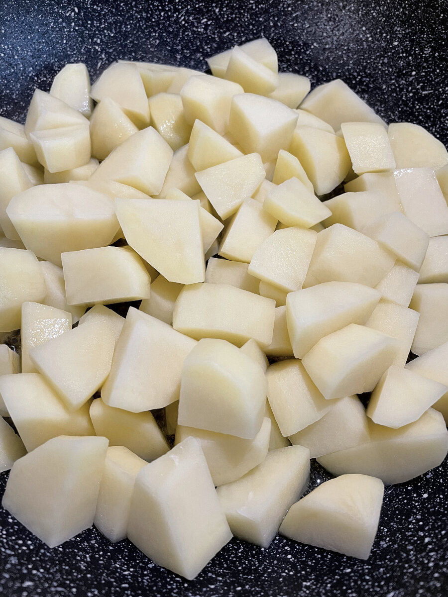 ИНГРЕДИЕНТЫ Любителям мяса с картошкой, посвящается! Картофель почистила, помыла, разрезала на четвертинки, снова промыла водой и разложила сушиться на бумажном полотенце. Когда картофель хорошо обсох, положила его обжариваться в сковороду на топленном масле, почти до готовности. Как только картофель аппетитно зарумянился, перекладываю его в казан. Затем в сковороде обжарила свиную вырезку порезанную на кубики. И готовую, переложила к картофелю. Репчатый лук нарезала перьями, морковь четвертинками, горький перец полукольцами и все вместе обжарила на сковороде. Готовые овощи положила в казан к мясу с картофелем. Поджарка - блюдо простое, поэтому хочу обогатить вкус мяса и картофеля букетом ароматных специй. Для этого в ступку поместила несколько горошин душистого перца, зерна горчицы, сухой хрен, зерна кориандра и тщательно размолола их пестиком. Добавила сушеный жаренный лук. И немного хлопьев чили перца с солью. Теперь эту душистую смесь заливаю крутым кипятком и хорошенько пере